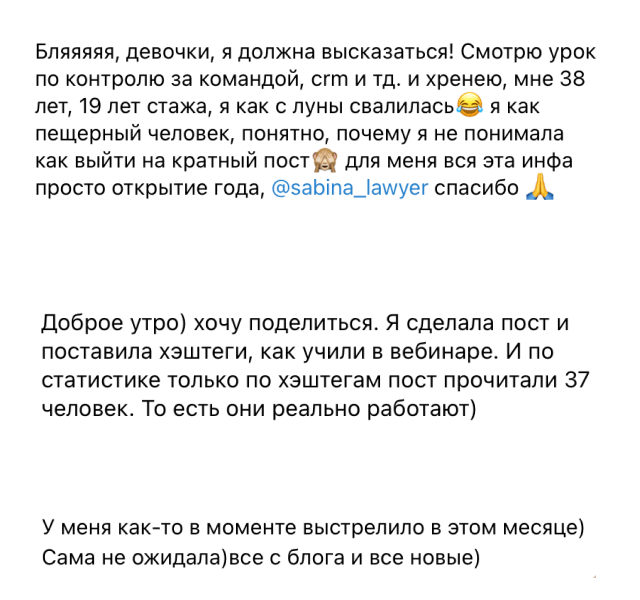 — Инстаграм упакован не продающе для юриста, клиентов из онлайна не было, в сторис не продавала